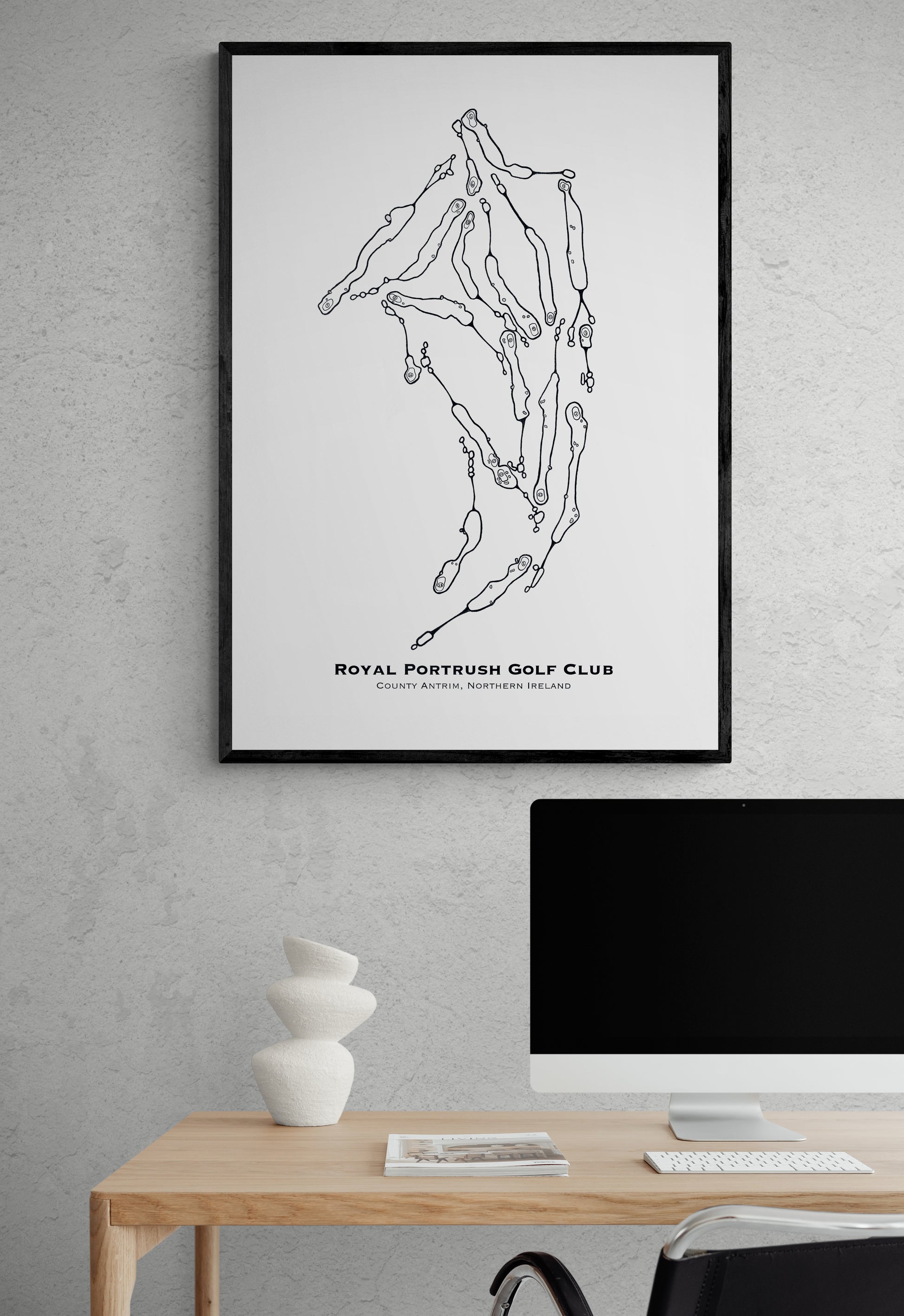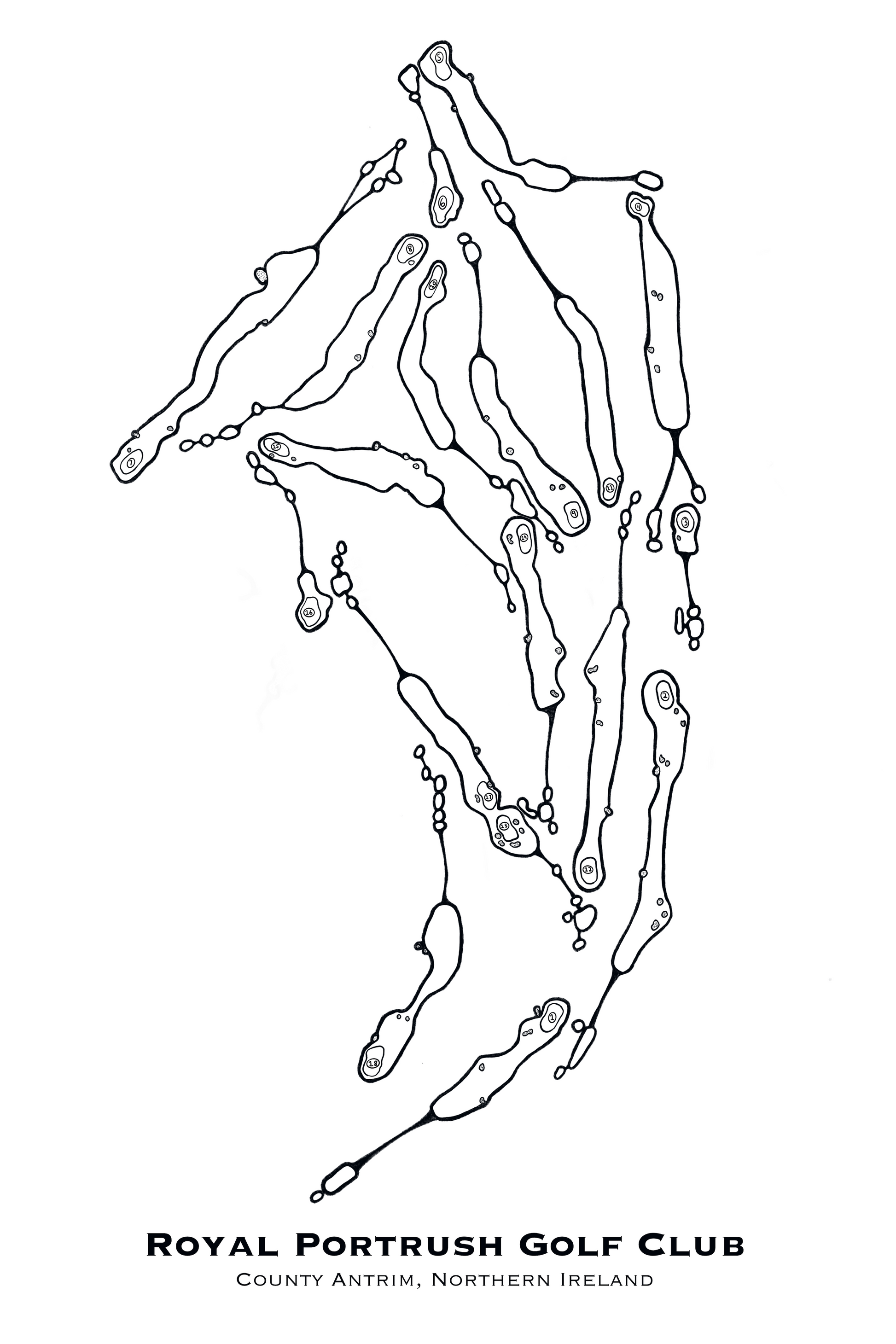 Enjoy our hand drawn, to-scale, high quality prints highlighting all eighteen holes and showcasing Royal Portrush's grand scale as it lays out across the dunescape of Northern Ireland. Our prints are perfect for the golf lover's office, living or recreation rooms.